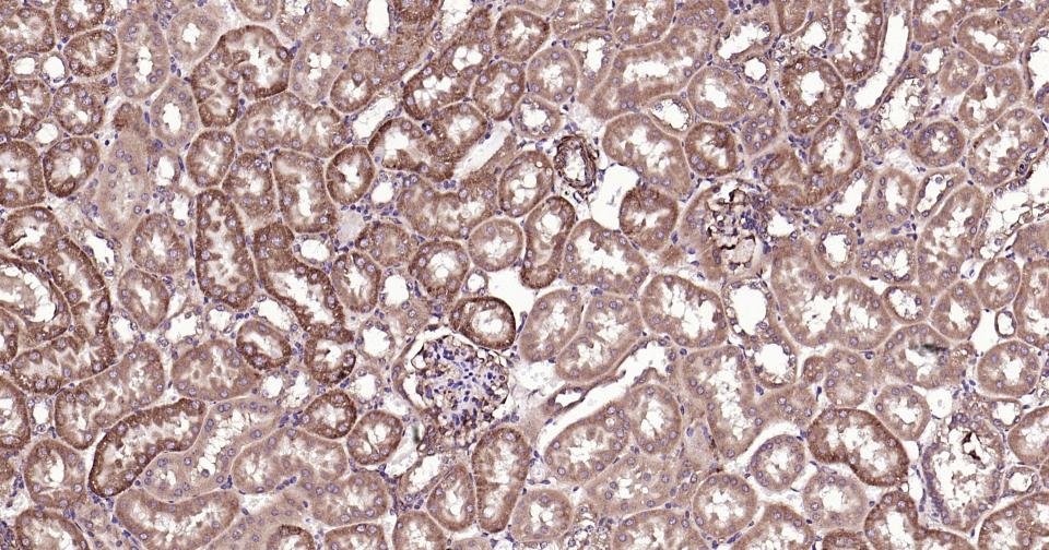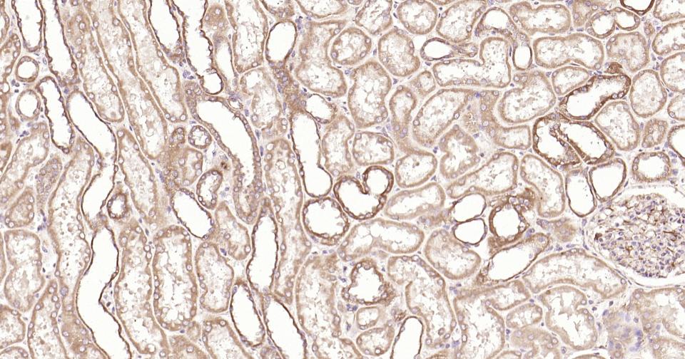 Paraformaldehyde-fixed, paraffin embedded Mouse Kidney; Antigen retrieval by boiling in sodium citrate buffer (pH6.0) for 15 min; Antibody incubation with PIK3R3 Monoclonal Antibody, Unconjugated(bsm-61060R) at 1:300 overnight at 4°C, followed by conjugation to the SP Kit (Rabbit, SP-0023) and DAB (C-0010) staining.