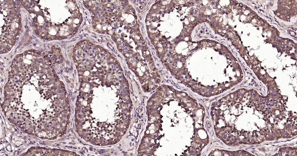 Paraformaldehyde-fixed, paraffin embedded Human Testicles; Antigen retrieval by boiling in sodium citrate buffer (pH6.0) for 15 min; Antibody incubation with PIK3R3 Monoclonal Antibody, Unconjugated(bsm-61060R) at 1:300 overnight at 4°C, followed by conjugation to the SP Kit (Rabbit, SP-0023) and DAB (C-0010) staining.