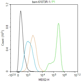 The HepG2 (H) cells were fixed with 4% PFA (10 min at r.t.) and then permeabilized with 90% ice-cold methanol for 20 min at -20℃,the cells then were incubated in 5%BSA to block non-specific protein-protein interactions (30 min at r.t.).Primary Antibody (green): Rabbit Anti-MEIS2 antibody (bsm-61073R): 1 μg/10^6 cells; Secondary Antibody (white blue): Goat anti-Rabbit IgG-FITC (bs-60295G-FITC): 1 μg/test. Isotype Control (orange): Rabbit IgG (bs-0295P). Blank control (black): PBS. Acquisition of 20,000 events was performed.