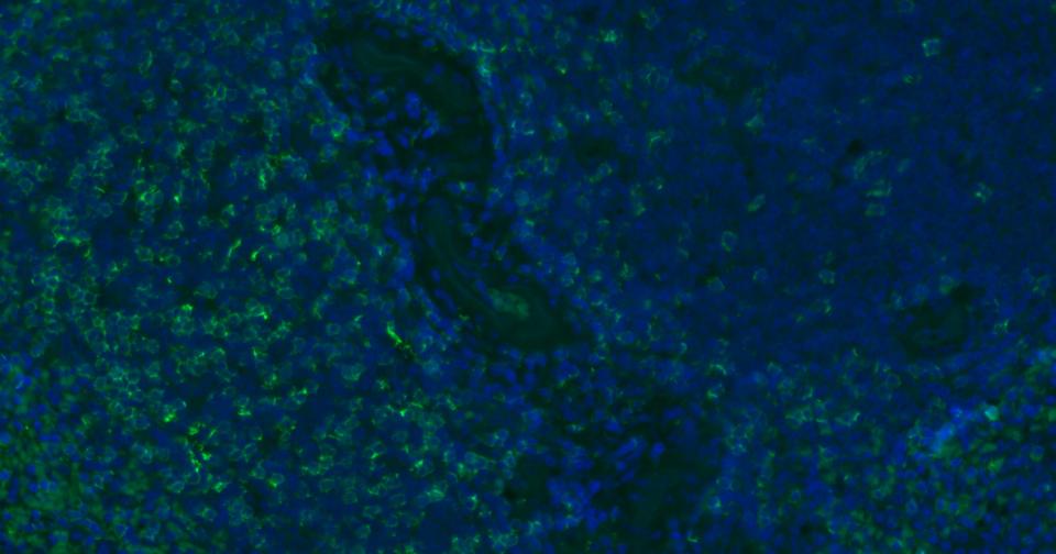 Paraformaldehyde-fixed, paraffin embedded Human Spleen; Antigen retrieval by boiling in sodium citrate buffer (pH6.0) for 15 min; Antibody incubation with CD8 Polyclonal Antibody, Unconjugated (bsm-61078R) at 1:200 overnight at 4°C. Followed by conjugated Goat Anti-Rabbit IgG antibody (green, bs-0295G-BF488), DAPI (blue, C02-04002) was used to stain the cell nuclei.