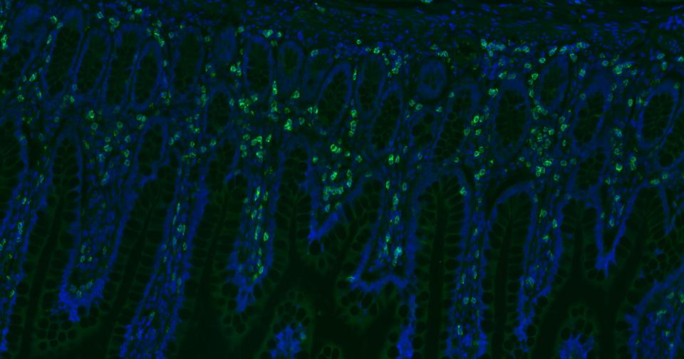 Paraformaldehyde-fixed, paraffin embedded Human Small Intestine; Antigen retrieval by boiling in sodium citrate buffer (pH6.0) for 15 min; Antibody incubation with CD8 Polyclonal Antibody, Unconjugated (bsm-61078R) at 1:200 overnight at 4°C. Followed by conjugated Goat Anti-Rabbit IgG antibody (green, bs-0295G-BF488), DAPI (blue, C02-04002) was used to stain the cell nuclei.