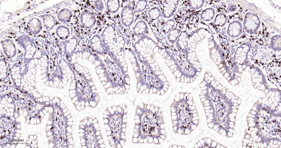 Paraformaldehyde-fixed, paraffin embedded Human Small Intestine; Antigen retrieval by boiling in sodium citrate buffer (pH6.0) for 15 min; The section was incubated with CD8 Monoclonal Antibody, Unconjugated (bsm-61078R) at 1:800 overnight at 4°C, followed by conjugation to the bs-0295G-HRP and DAB (C-0010) staining.