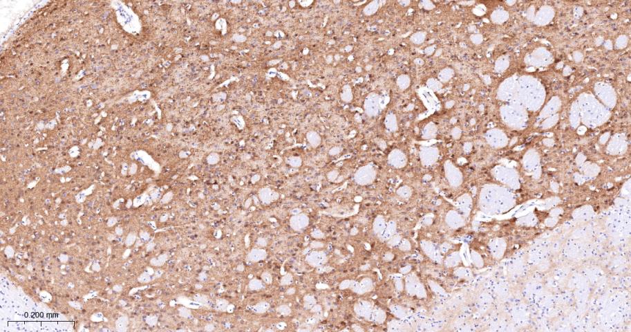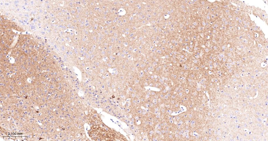 Paraformaldehyde-fixed, paraffin embedded Rat Cerebrum; Antigen retrieval by boiling in sodium citrate buffer (pH6.0) for 15 min; The section was incubated with Alpha Actinin 2 Monoclonal Antibody, Unconjugated (bsm-52812R) at 1:200 overnight at 4°C, followed by conjugation to the bs-0295G-HRP and DAB (C-0010) staining.
