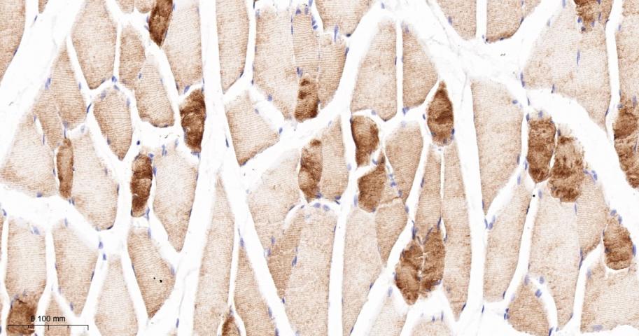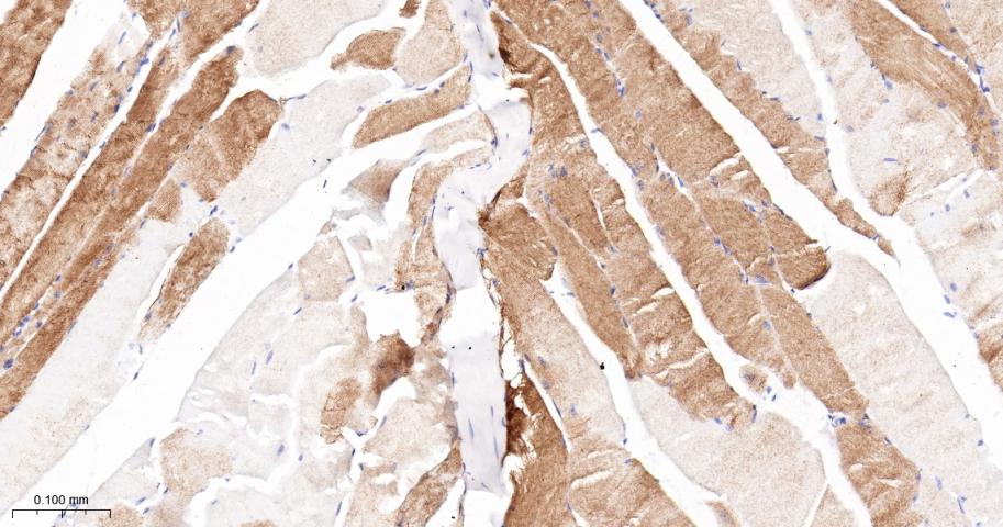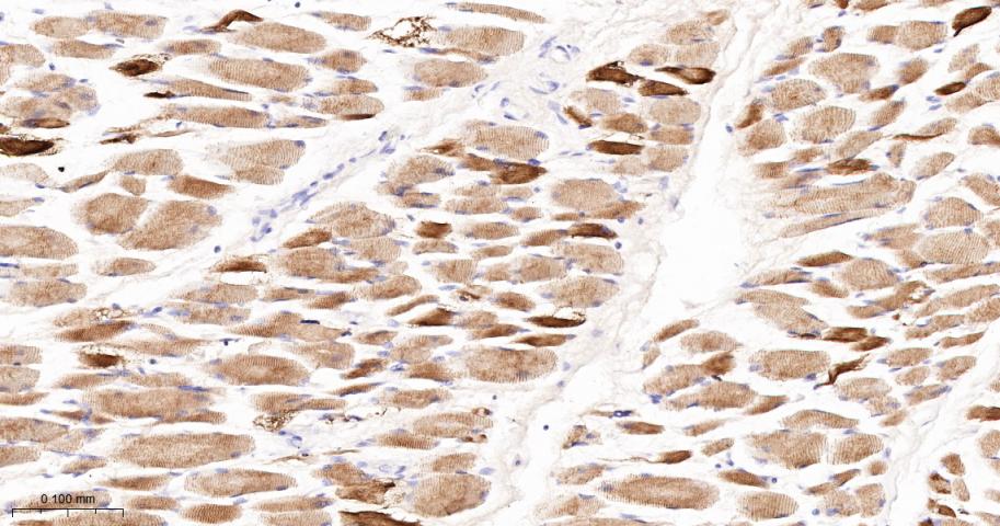 Paraformaldehyde-fixed, paraffin embedded Mouse Skeletal muscle; Antigen retrieval by boiling in sodium citrate buffer (pH6.0) for 15 min; The section was incubated with Alpha Actinin 2 Monoclonal Antibody, Unconjugated (bsm-52812R) at 1:200 overnight at 4°C, followed by conjugation to the bs-0295G-HRP and DAB (C-0010) staining.