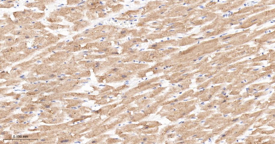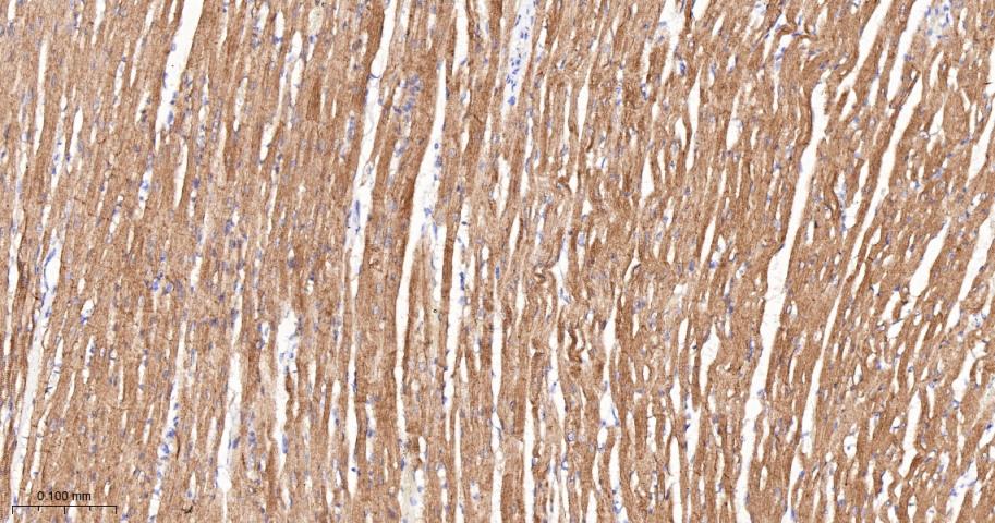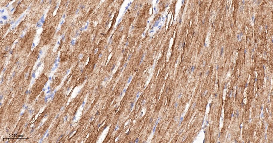 Paraformaldehyde-fixed, paraffin embedded Rat Heart; Antigen retrieval by boiling in sodium citrate buffer (pH6.0) for 15 min; The section was incubated with Alpha Actinin 2 Monoclonal Antibody, Unconjugated (bsm-52812R) at 1:200 overnight at 4°C, followed by conjugation to the bs-0295G-HRP and DAB (C-0010) staining.