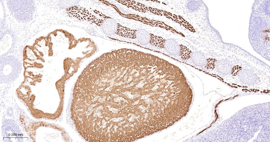 Paraformaldehyde-fixed, paraffin embedded Rat Embryo; Antigen retrieval by boiling in sodium citrate buffer (pH6.0) for 15 min; The section was incubated with Alpha Actinin 2 Monoclonal Antibody, Unconjugated (bsm-52812R) at 1:200 overnight at 4°C, followed by conjugation to the bs-0295G-HRP and DAB (C-0010) staining.