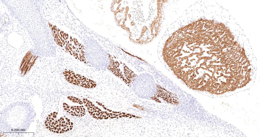 Paraformaldehyde-fixed, paraffin embedded Mouse Embryo; Antigen retrieval by boiling in sodium citrate buffer (pH6.0) for 15 min; The section was incubated with Alpha Actinin 2 Monoclonal Antibody, Unconjugated (bsm-52812R) at 1:200 overnight at 4°C, followed by conjugation to the bs-0295G-HRP and DAB (C-0010) staining.