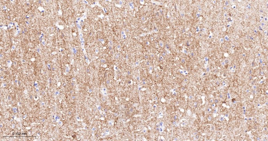 Paraformaldehyde-fixed, paraffin embedded Human Cerebrum; Antigen retrieval by boiling in sodium citrate buffer (pH6.0) for 15 min; The section was incubated with Alpha Actinin 2 Monoclonal Antibody, Unconjugated (bsm-52812R) at 1:200 overnight at 4°C, followed by conjugation to the bs-0295G-HRP and DAB (C-0010) staining.