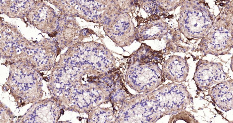 Paraformaldehyde-fixed, paraffin embedded Human Testicles; Antigen retrieval by boiling in sodium citrate buffer (pH6.0) for 15 min; The section was incubated with Collagen III Monoclonal Antibody, Unconjugated (bsm-54793R) at 1:500 overnight at 4°C, followed by conjugation to the bs-0295G-HRP and DAB (C-0010) staining.