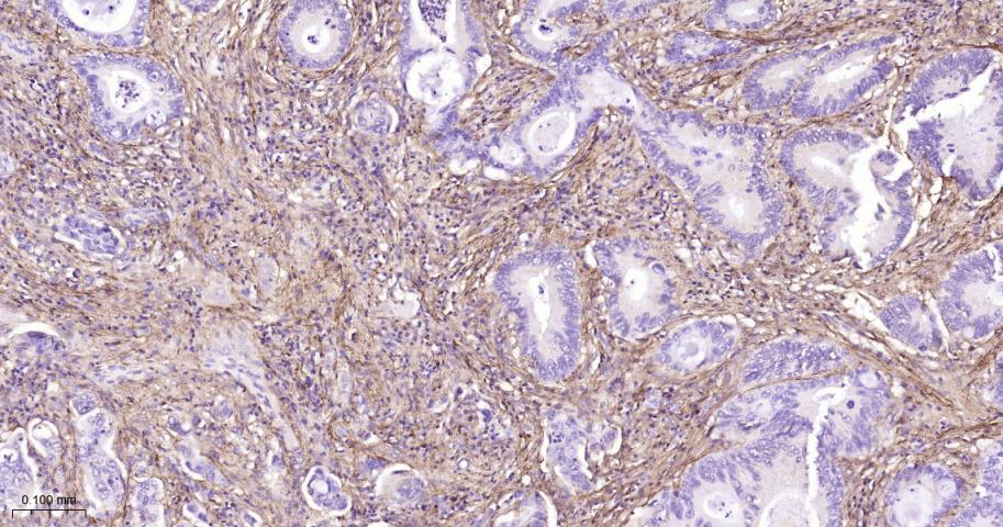 Paraformaldehyde-fixed, paraffin embedded Human Colon Cancer; Antigen retrieval by boiling in sodium citrate buffer (pH6.0) for 15 min; The section was incubated with Collagen III Monoclonal Antibody, Unconjugated (bsm-54793R) at 1:500 overnight at 4°C, followed by conjugation to the bs-0295G-HRP and DAB (C-0010) staining.