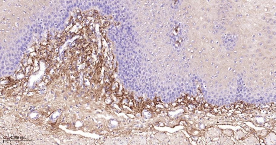 Paraformaldehyde-fixed, paraffin embedded Human Esophagus; Antigen retrieval by boiling in sodium citrate buffer (pH6.0) for 15 min; The section was incubated with Collagen III Monoclonal Antibody, Unconjugated (bsm-54793R) at 1:500 overnight at 4°C, followed by conjugation to the bs-0295G-HRP and DAB (C-0010) staining.