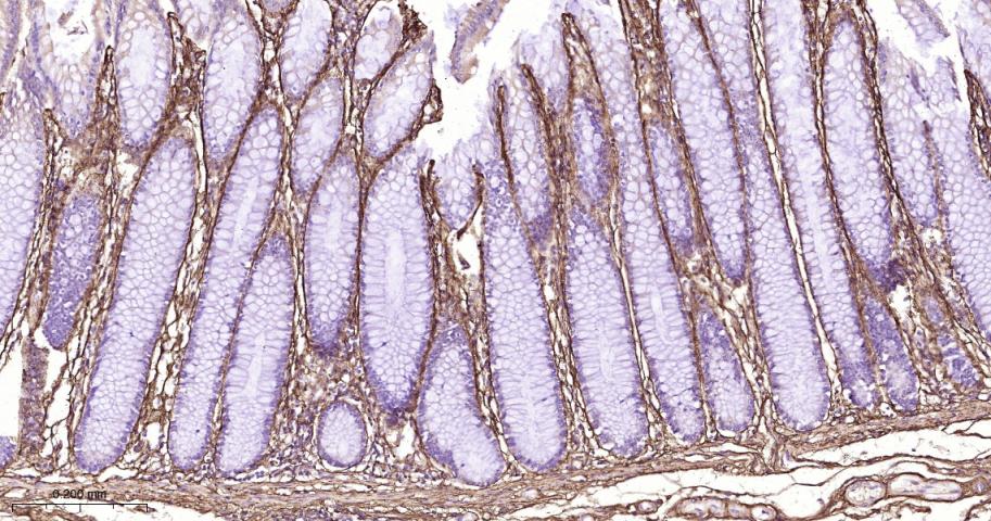 Paraformaldehyde-fixed, paraffin embedded Human Colon; Antigen retrieval by boiling in sodium citrate buffer (pH6.0) for 15 min; The section was incubated with Collagen III Monoclonal Antibody, Unconjugated (bsm-54793R) at 1:500 overnight at 4°C, followed by conjugation to the bs-0295G-HRP and DAB (C-0010) staining.