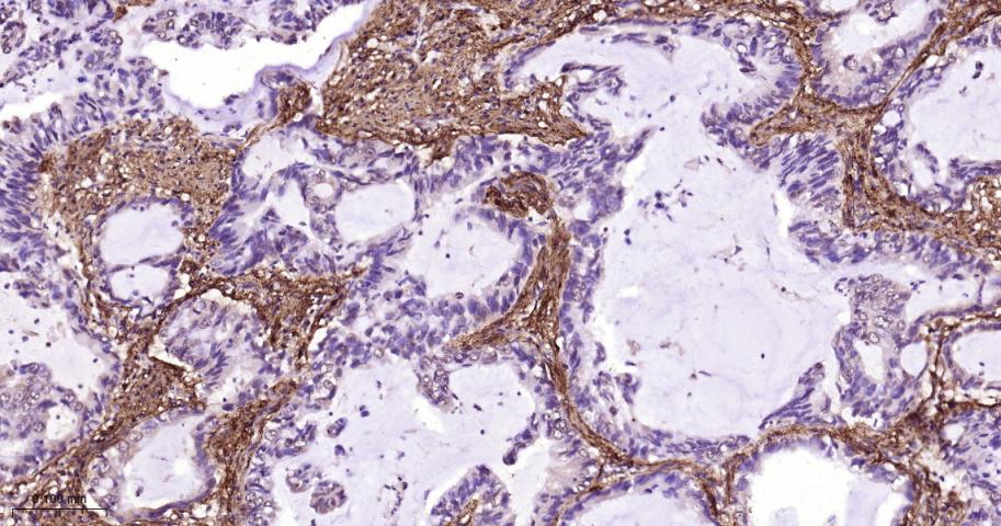 Paraformaldehyde-fixed, paraffin embedded Human Lung Cancer; Antigen retrieval by boiling in sodium citrate buffer (pH6.0) for 15 min; The section was incubated with Collagen III Monoclonal Antibody, Unconjugated (bsm-54793R) at 1:500 overnight at 4°C, followed by conjugation to the bs-0295G-HRP and DAB (C-0010) staining.