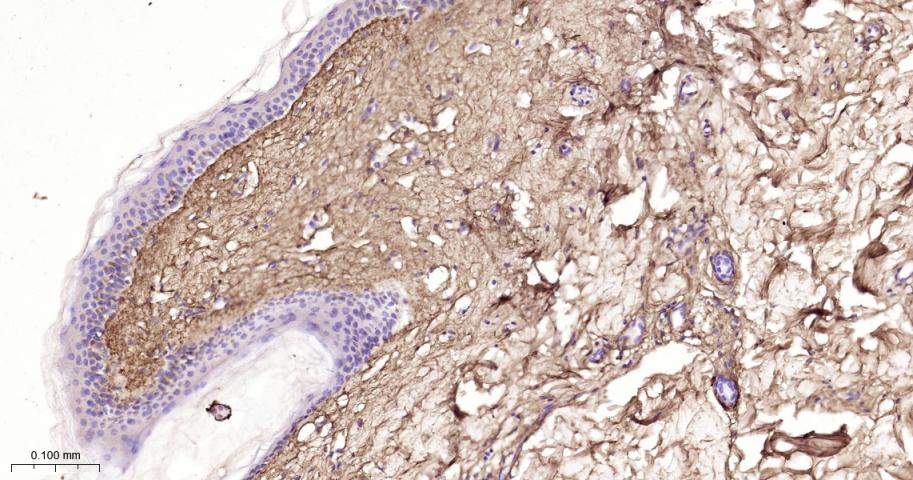 Paraformaldehyde-fixed, paraffin embedded Human Abdominal skin; Antigen retrieval by boiling in sodium citrate buffer (pH6.0) for 15 min; The section was incubated with Collagen III Monoclonal Antibody, Unconjugated (bsm-54793R) at 1:500 overnight at 4°C, followed by conjugation to the bs-0295G-HRP and DAB (C-0010) staining.