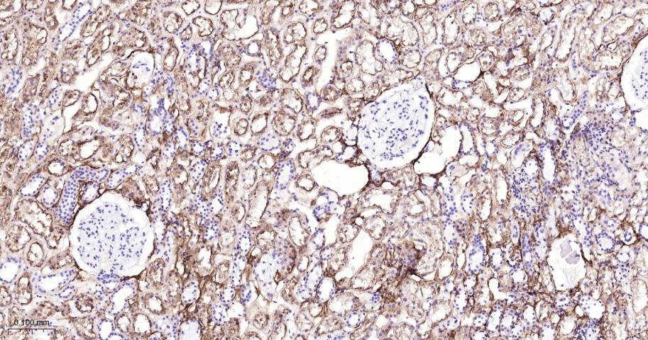 Paraformaldehyde-fixed, paraffin embedded Human Kidney; Antigen retrieval by boiling in sodium citrate buffer (pH6.0) for 15 min; The section was incubated with Collagen III Monoclonal Antibody, Unconjugated (bsm-54793R) at 1:500 overnight at 4°C, followed by conjugation to the bs-0295G-HRP and DAB (C-0010) staining.