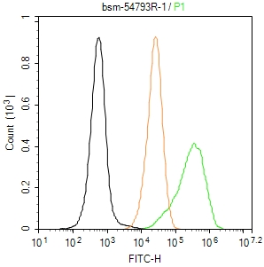 The RD (H) cells were fixed with 4% PFA (10 min at r.t.) and then permeabilized with 90% ice-cold methanol for 20 min at -20℃,the cells then were incubated in 5%BSA to block non-specific protein-protein interactions (30 min at r.t.).Primary Antibody (green):Rabbit Anti-Collagen III antibody (bsm-54793R),dilution: 1:100; Isotype Control (orange): Rabbit IgG (bs-0295P). Blank control (black): PBS. Acquisition of 20,000 events was performed.