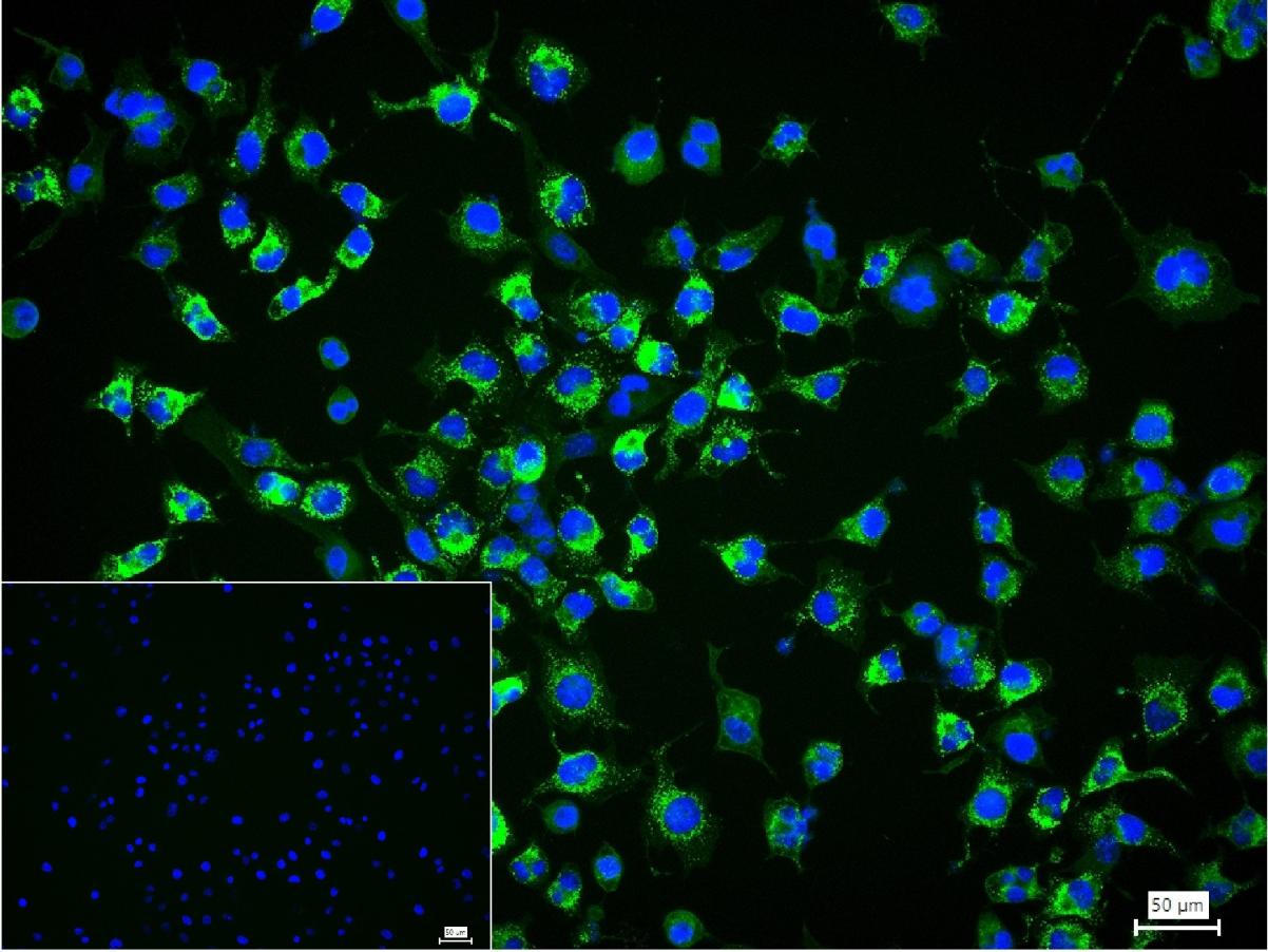 4% Paraformaldehyde-fixed RD (H) cell; Triton X-100 at r.t. for 20 min; Antibody incubation with (Collagen III) monoclonal Antibody, unconjugated (bsm-54793R) 1:100, 90 min at 37°C; followed by conjugated Goat Anti-Rabbit IgG antibody (green, bs-60295G-BF488) at 37°C for 90 min, DAPI (blue, C02-04002) was used to stain the cell nuclei. PBS instead of the primary antibody was used as the blank control.