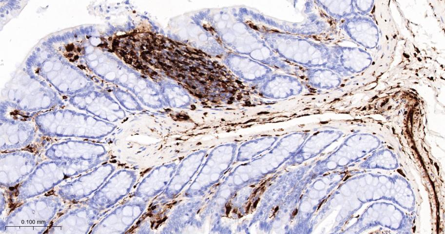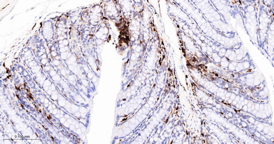 Paraformaldehyde-fixed, paraffin embedded Mouse Colon; Antigen retrieval by boiling in sodium citrate buffer (pH6.0) for 15 min; The section was incubated with S100A4 Monoclonal Antibody, Unconjugated (bsm-55522R) at 1:500 overnight at 4°C, followed by conjugation to the bs-0295G-HRP and DAB (C-0010) staining.