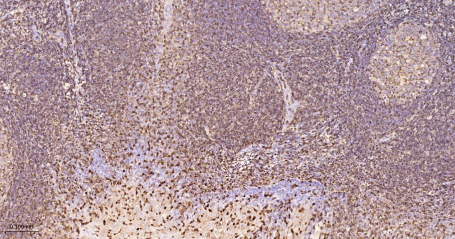 Paraformaldehyde-fixed, paraffin embedded Human Tonsil; Antigen retrieval by boiling in sodium citrate buffer (pH6.0) for 15 min; The section was incubated with S100A4 Monoclonal Antibody, Unconjugated (bsm-55522R) at 1:500 overnight at 4°C, followed by conjugation to the bs-0295G-HRP and DAB (C-0010) staining.