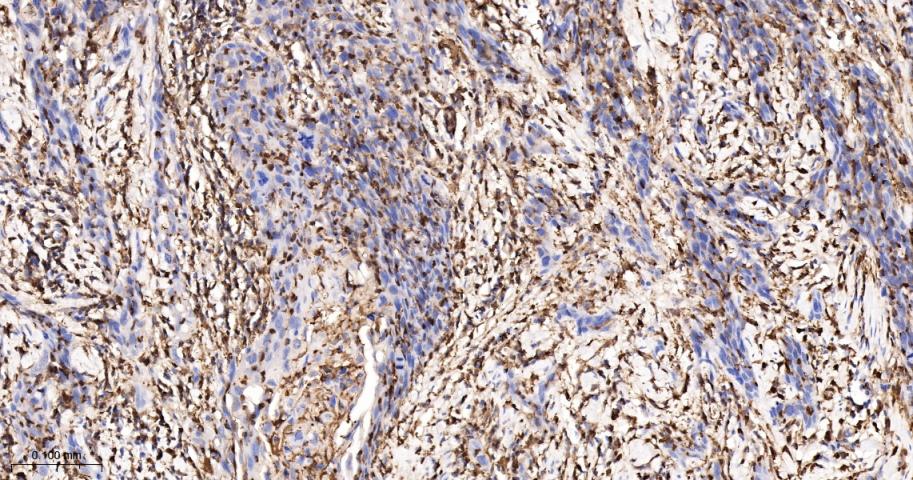 Paraformaldehyde-fixed, paraffin embedded Human Cervical Cancer; Antigen retrieval by boiling in sodium citrate buffer (pH6.0) for 15 min; The section was incubated with S100A4 Monoclonal Antibody, Unconjugated (bsm-55522R) at 1:500 overnight at 4°C, followed by conjugation to the bs-0295G-HRP and DAB (C-0010) staining.