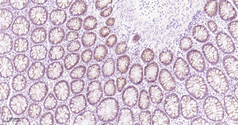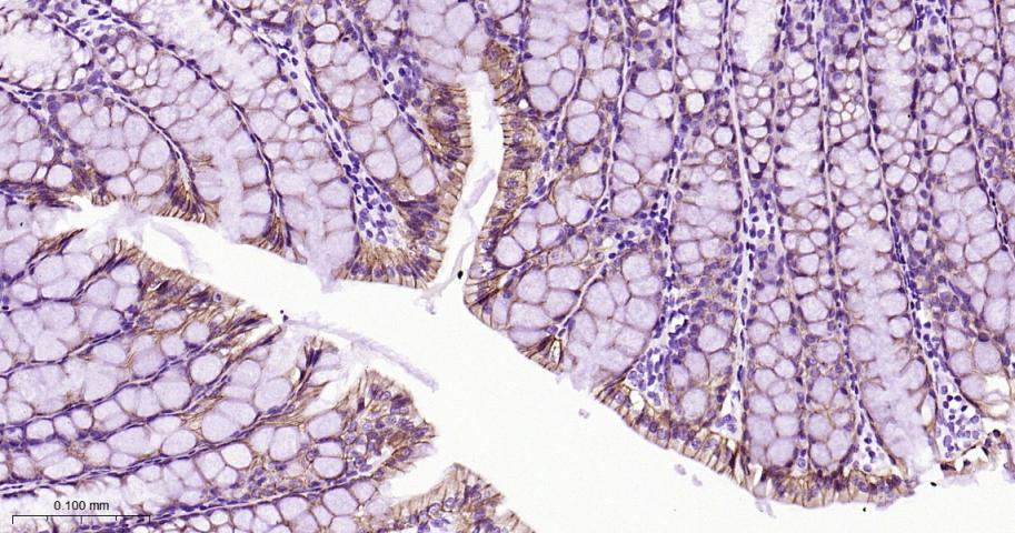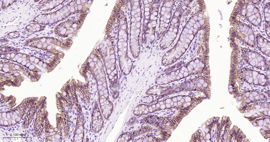 Paraformaldehyde-fixed, paraffin embedded Mouse Colon; Antigen retrieval by boiling in sodium citrate buffer (pH6.0) for 15 min; Antibody incubation with beta Catenin Monoclonal Antibody, Unconjugated(bsm-55526R) at 1:200 overnight at 4°C, followed by conjugation to the bs-0295G-HRP and DAB (C-0010) staining.