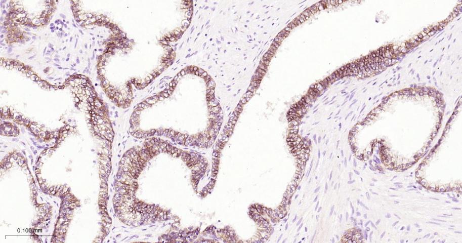 Paraformaldehyde-fixed, paraffin embedded Human Prostate Cancer; Antigen retrieval by boiling in sodium citrate buffer (pH6.0) for 15 min; Antibody incubation with beta Catenin Monoclonal Antibody, Unconjugated(bsm-55526R) at 1:200 overnight at 4°C, followed by conjugation to the bs-0295G-HRP and DAB (C-0010) staining.