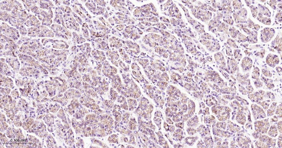 Paraformaldehyde-fixed, paraffin embedded Rat Pancreas; Antigen retrieval by boiling in sodium citrate buffer (pH6.0) for 15 min; Antibody incubation with beta Catenin Monoclonal Antibody, Unconjugated(bsm-55526R) at 1:200 overnight at 4°C, followed by conjugation to the bs-0295G-HRP and DAB (C-0010) staining.