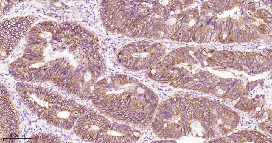Paraformaldehyde-fixed, paraffin embedded Human Colon Cancer; Antigen retrieval by boiling in sodium citrate buffer (pH6.0) for 15 min; Antibody incubation with beta Catenin Monoclonal Antibody, Unconjugated(bsm-55526R) at 1:200 overnight at 4°C, followed by conjugation to the bs-0295G-HRP and DAB (C-0010) staining.