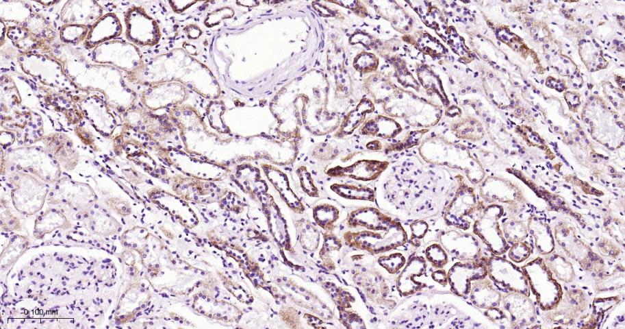 Paraformaldehyde-fixed, paraffin embedded Human Kidney; Antigen retrieval by boiling in sodium citrate buffer (pH6.0) for 15 min; Antibody incubation with beta Catenin Monoclonal Antibody, Unconjugated(bsm-55526R) at 1:200 overnight at 4°C, followed by conjugation to the bs-0295G-HRP and DAB (C-0010) staining.
