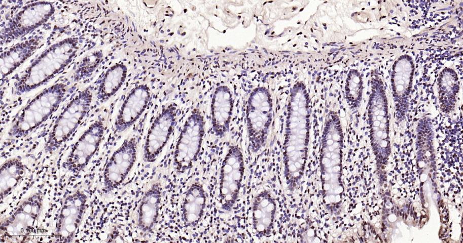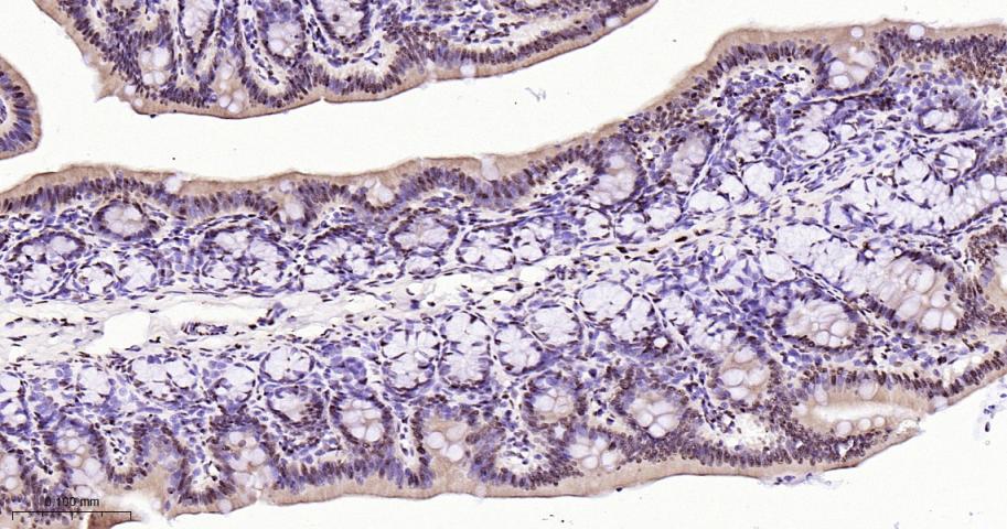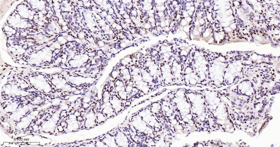 Paraformaldehyde-fixed, paraffin embedded Mouse Colon; Antigen retrieval by boiling in sodium citrate buffer (pH6.0) for 15 min; The section was incubated with Phospho-p38 (T180/Y182) Monoclonal Antibody, Unconjugated (bsm-55528R) at 1:200 overnight at 4°C, followed by conjugation to the bs-0295G-HRP and DAB (C-0010) staining.