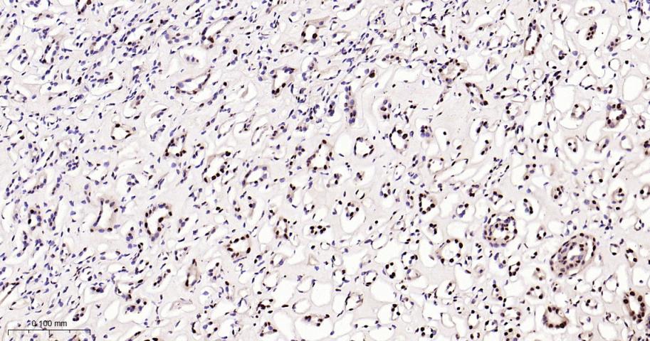 Paraformaldehyde-fixed, paraffin embedded Human Kidney; Antigen retrieval by boiling in sodium citrate buffer (pH6.0) for 15 min; The section was incubated with Phospho-p38 (T180/Y182) Monoclonal Antibody, Unconjugated (bsm-55528R) at 1:200 overnight at 4°C, followed by conjugation to the bs-0295G-HRP and DAB (C-0010) staining.