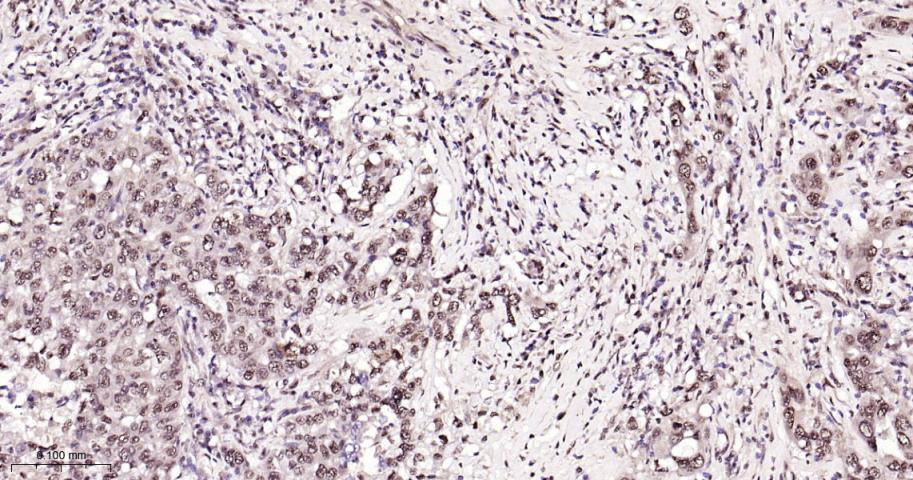 Paraformaldehyde-fixed, paraffin embedded Human Breast Cancer; Antigen retrieval by boiling in sodium citrate buffer (pH6.0) for 15 min; The section was incubated with Phospho-p38 (T180/Y182) Monoclonal Antibody, Unconjugated (bsm-55528R) at 1:200 overnight at 4°C, followed by conjugation to the bs-0295G-HRP and DAB (C-0010) staining.