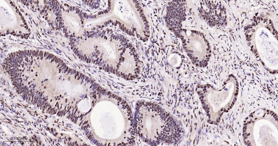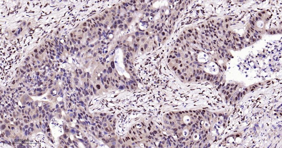 Paraformaldehyde-fixed, paraffin embedded Human Colon Cancer; Antigen retrieval by boiling in sodium citrate buffer (pH6.0) for 15 min; The section was incubated with Phospho-p38 (T180/Y182) Monoclonal Antibody, Unconjugated (bsm-55528R) at 1:200 overnight at 4°C, followed by conjugation to the bs-0295G-HRP and DAB (C-0010) staining.