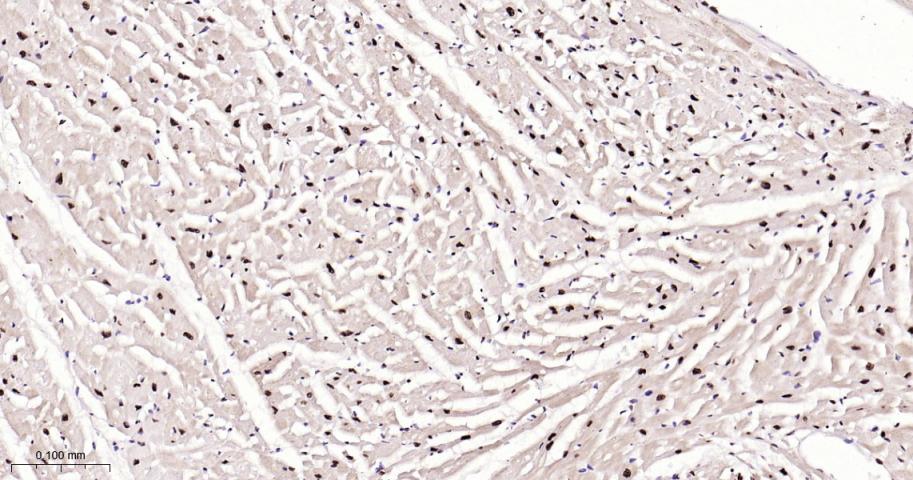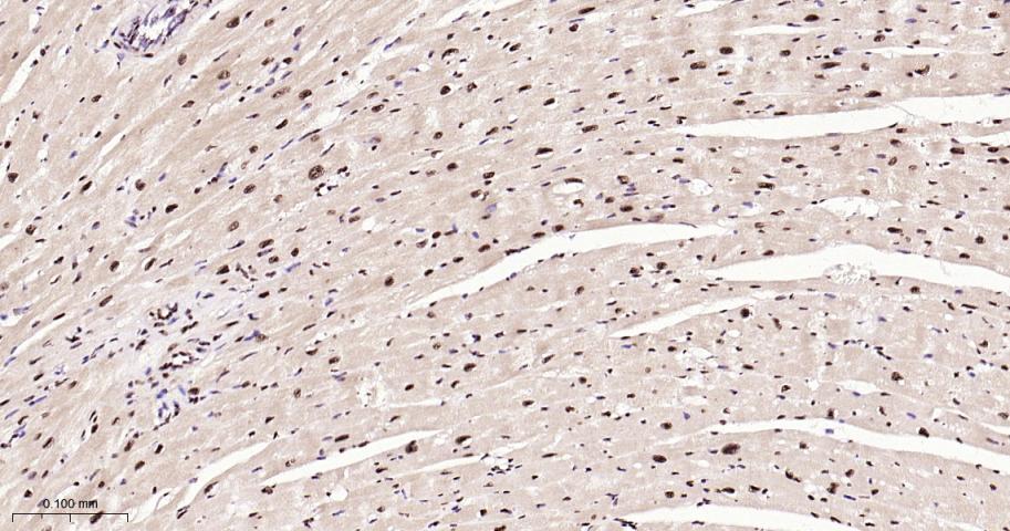 Paraformaldehyde-fixed, paraffin embedded Mouse Heart; Antigen retrieval by boiling in sodium citrate buffer (pH6.0) for 15 min; The section was incubated with Phospho-p38 (T180/Y182) Monoclonal Antibody, Unconjugated (bsm-55528R) at 1:200 overnight at 4°C, followed by conjugation to the bs-0295G-HRP and DAB (C-0010) staining.