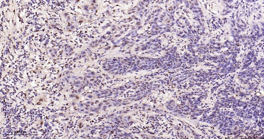 Paraformaldehyde-fixed, paraffin embedded Human Lung Cancer; Antigen retrieval by boiling in sodium citrate buffer (pH6.0) for 15 min; The section was incubated with Phospho-p38 (T180/Y182) Monoclonal Antibody, Unconjugated (bsm-55528R) at 1:200 overnight at 4°C, followed by conjugation to the bs-0295G-HRP and DAB (C-0010) staining.
