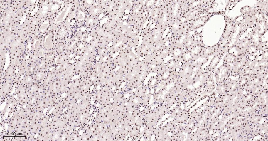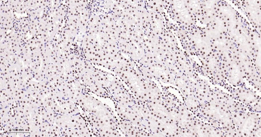 Paraformaldehyde-fixed, paraffin embedded Rat Kidney; Antigen retrieval by boiling in sodium citrate buffer (pH6.0) for 15 min; The section was incubated with Phospho-p38 (T180/Y182) Monoclonal Antibody, Unconjugated (bsm-55528R) at 1:200 overnight at 4°C, followed by conjugation to the bs-0295G-HRP and DAB (C-0010) staining.