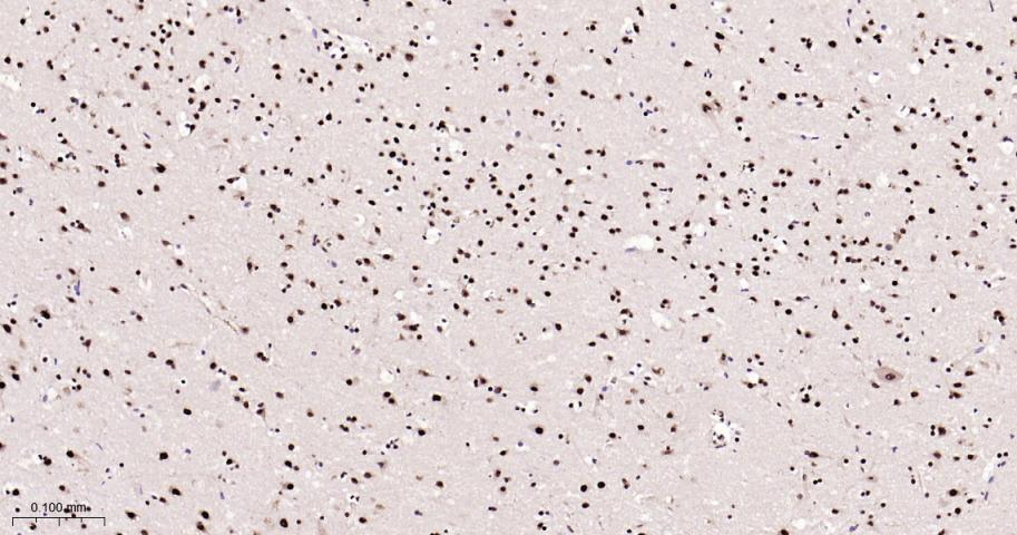 Paraformaldehyde-fixed, paraffin embedded Human Cerebrum; Antigen retrieval by boiling in sodium citrate buffer (pH6.0) for 15 min; The section was incubated with Phospho-p38 (T180/Y182) Monoclonal Antibody, Unconjugated (bsm-55528R) at 1:200 overnight at 4°C, followed by conjugation to the bs-0295G-HRP and DAB (C-0010) staining.