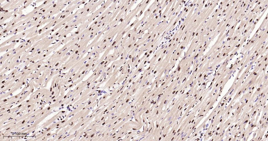 Paraformaldehyde-fixed, paraffin embedded Rat Heart; Antigen retrieval by boiling in sodium citrate buffer (pH6.0) for 15 min; The section was incubated with Phospho-p38 (T180/Y182) Monoclonal Antibody, Unconjugated (bsm-55528R) at 1:200 overnight at 4°C, followed by conjugation to the bs-0295G-HRP and DAB (C-0010) staining.