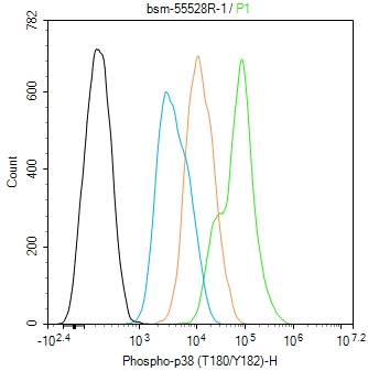 The Hela ( treated with 200J/m2 UV-C then recovery for 30 min) (H) cells were fixed with 4% PFA (10 min at r.t.) and then permeabilized with 90% ice-cold methanol for 20 min at -20℃,the cells then were incubated in 5%BSA to block non-specific protein-protein interactions (30 min at r.t.).Primary Antibody (green):Rabbit Anti-Phospho-p38 (T180/Y182) antibody (bsm-55528R): 1:50-100; Secondary Antibody (white blue): Goat anti-Rabbit IgG-BF488 (bs-60295G-BF488): 1 μg/test. Isotype Control (orange): Rabbit IgG (bs-0295P). Blank control (black): PBS. Acquisition of 20,000 events was performed.