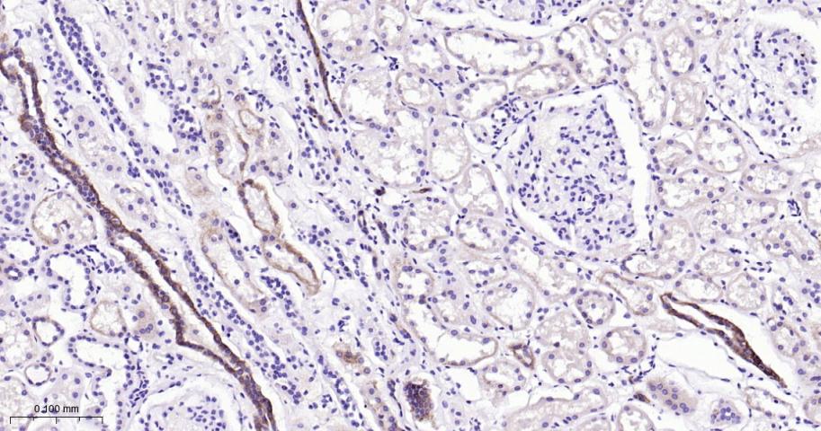Paraformaldehyde-fixed, paraffin embedded Human kidney; Antigen retrieval by boiling in sodium citrate buffer (pH6.0) for 15 min; Antibody incubation with ATG5 Monoclonal Antibody, Unconjugated(bsm-52596R) at 1:200 overnight at 4°C, followed by conjugation to the bs-0295G-HRP and DAB (C-0010) staining.