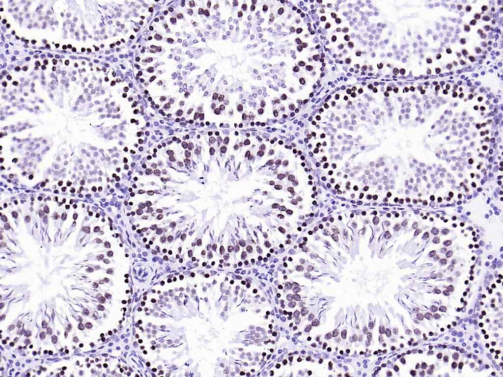 Paraformaldehyde-fixed, paraffin embedded (rat testis); Antigen retrieval by boiling in sodium citrate buffer (pH6.0) for 15min; Block endogenous peroxidase by 3% hydrogen peroxide for 20 minutes; Blocking buffer (normal goat serum) at 37°C for 30min; Antibody incubation with (BANF1) Monoclonal Antibody, Unconjugated (bsm-54435R) at 1:200 overnight at 4°C, followed by operating according to SP Kit(Rabbit) (sp-0023) instructionsand DAB staining.