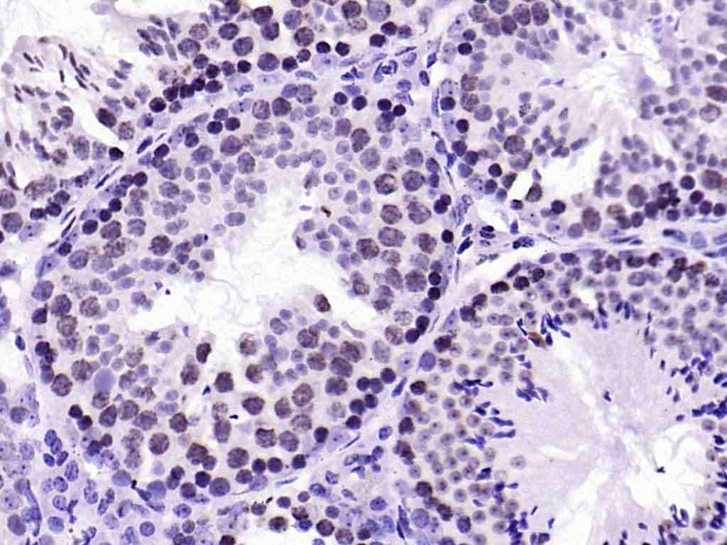 Paraformaldehyde-fixed, paraffin embedded (mouse testis); Antigen retrieval by boiling in sodium citrate buffer (pH6.0) for 15min; Block endogenous peroxidase by 3% hydrogen peroxide for 20 minutes; Blocking buffer (normal goat serum) at 37°C for 30min; Antibody incubation with ( BANF1) Monoclonal Antibody, Unconjugated (bsm-54435R) at 1:200 overnight at 4°C, followed by operating according to SP Kit(Rabbit) (sp-0023) instructionsand DAB staining.