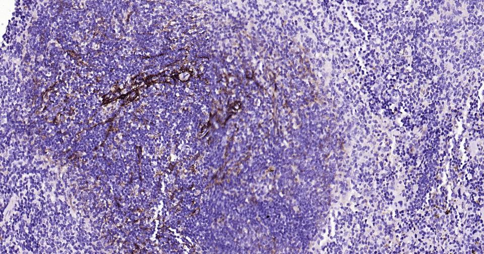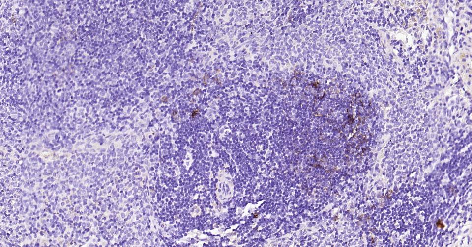 Paraformaldehyde-fixed, paraffin embedded Mouse Spleen; Antigen retrieval by boiling in sodium citrate buffer (pH6.0) for 15 min; Antibody incubation with NGFR/p75NTR Monoclonal Antibody, Unconjugated(bsm-52253R) at 1:200 overnight at 4°C, followed by conjugation to the bs-0295G-HRP and DAB (C-0010) staining.