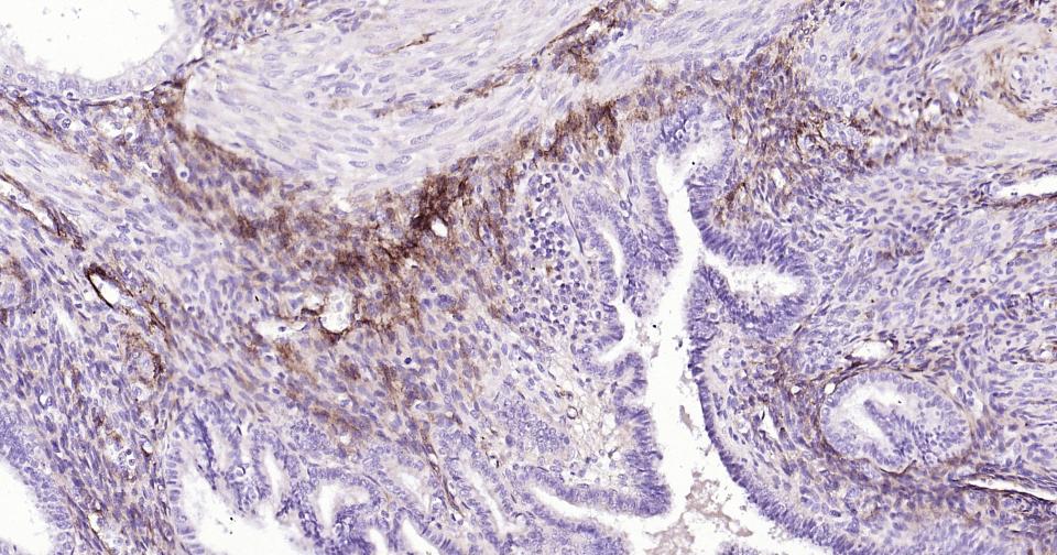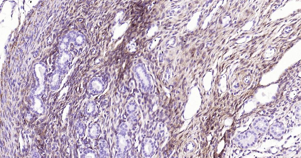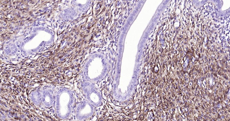 Paraformaldehyde-fixed, paraffin embedded Human Uterus; Antigen retrieval by boiling in sodium citrate buffer (pH6.0) for 15 min; Antibody incubation with NGFR/p75NTR Monoclonal Antibody, Unconjugated(bsm-52253R) at 1:200 overnight at 4°C, followed by conjugation to the bs-0295G-HRP and DAB (C-0010) staining.