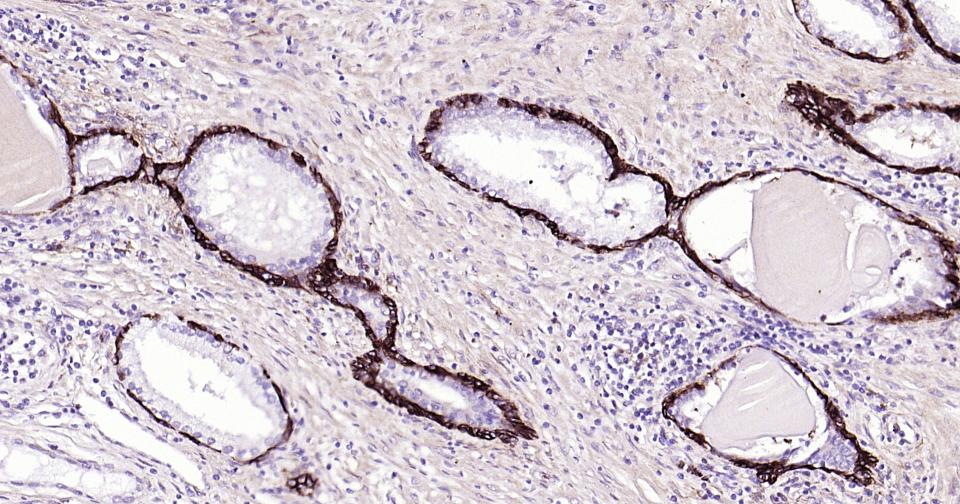 Paraformaldehyde-fixed, paraffin embedded Human Prostate; Antigen retrieval by boiling in sodium citrate buffer (pH6.0) for 15 min; Antibody incubation with NGFR/p75NTR Monoclonal Antibody, Unconjugated(bsm-52253R) at 1:200 overnight at 4°C, followed by conjugation to the bs-0295G-HRP and DAB (C-0010) staining.
