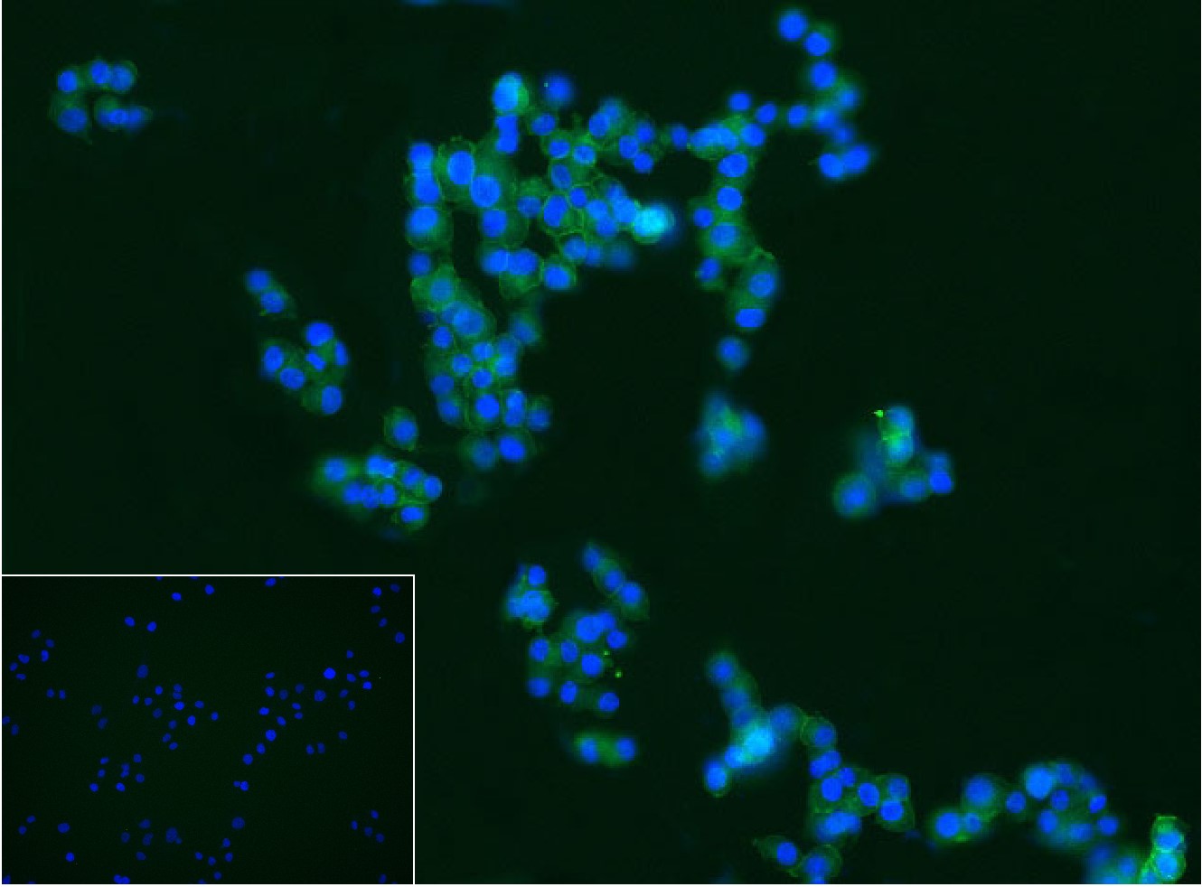4% Paraformaldehyde-fixed PC-12 (Rat) cell; Triton X-100 at r.t. for 20 min; Antibody incubation with (NGFR/p75NTR) monoclonal Antibody, unconjugated (bsm-52253R) 1:100, 90 min at 37°C; followed by conjugated Goat Anti-Rabbit IgG antibody (green,bs-40295G-FITC) at 37°C for 90 min, DAPI (blue, C02-04002) was used to stain the cell nuclei. PBS instead of the primary antibody was used as the blank control.