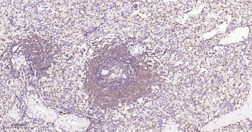 Immunohistochemical analysis of paraffin embedded Human spleen tissue slide using IHC0535H (Human UFM1 Kit).
