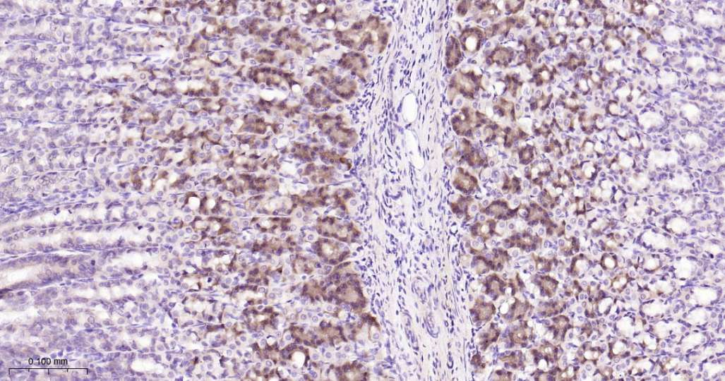 Immunohistochemical analysis of paraffin embedded Mouse stomach tissue slide using IHC0551M (Mouse GRP94 Kit).