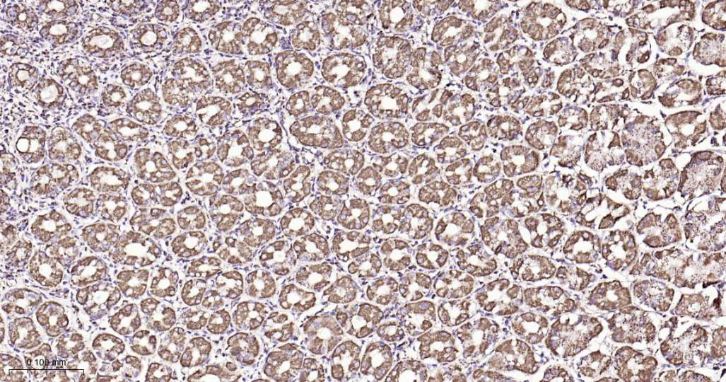 Immunohistochemical analysis of paraffin embedded Human stomach tissue slide using IHC0559H (Human Hsp10 Kit).