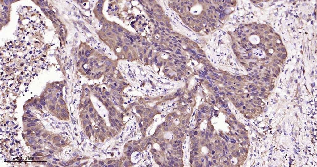 Immunohistochemical analysis of paraffin embedded Human breast cancer tissue slide using IHC0578H (Human NME1/NM23A Kit).